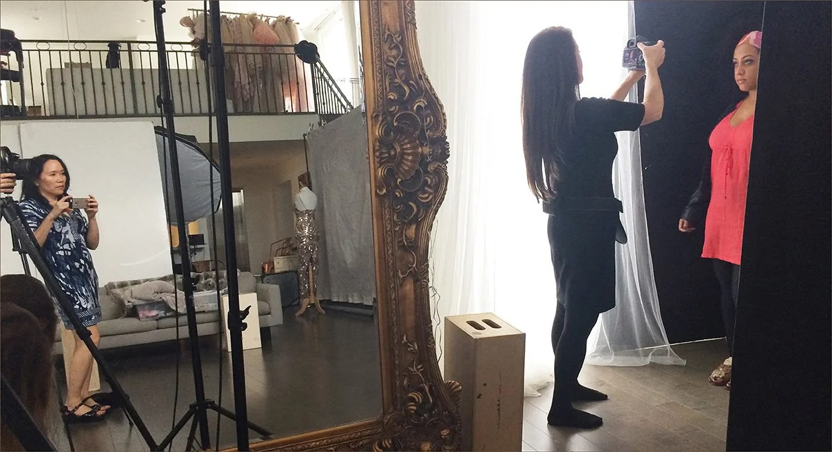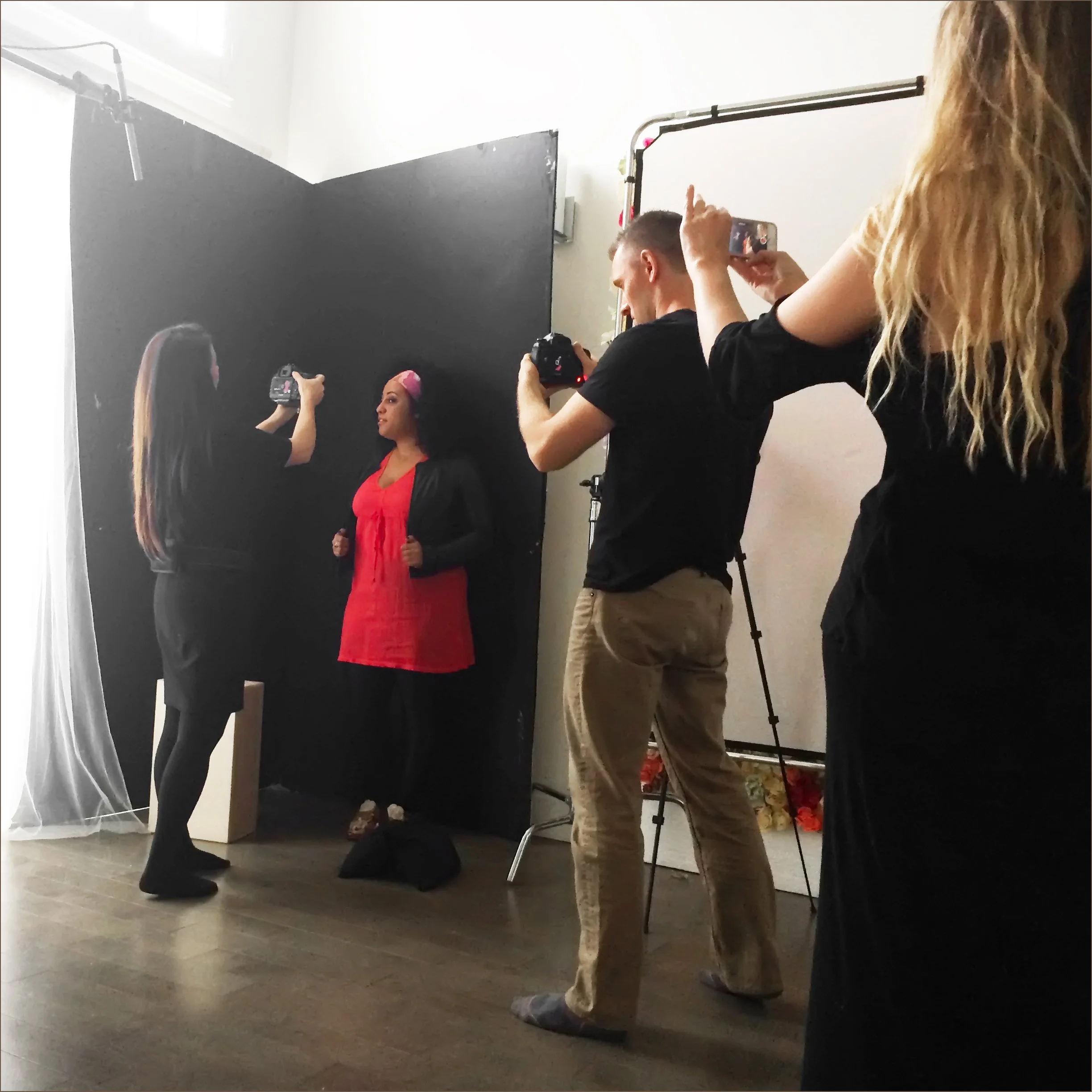First of all, look at all these people. How she keeps track of everyone in the room is a feat in itself. During a shoot there are so many moving parts – the client, lighting, assistants, makeup, wardrobe, equipment, backdrops, props… and because she is making videos of her process, this adds more to think about – visual storyboard, sound, educational content… not to mention the bodily needs of everyone in the room – bathroom breaks, hunger, temperature, stamina, doggie potty breaks, doggie snuggles, and you have a lot going on.