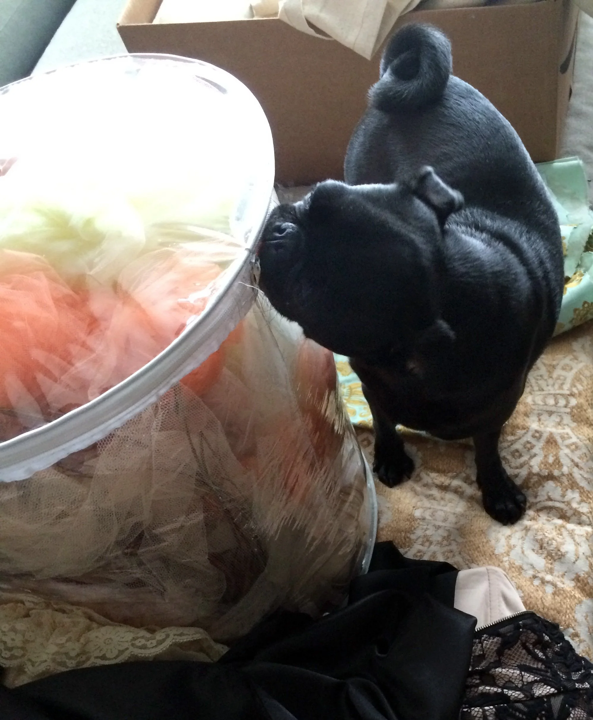 Even little Cookie (black pug standing on white couch upstairs) always keeps an eye on her girl.